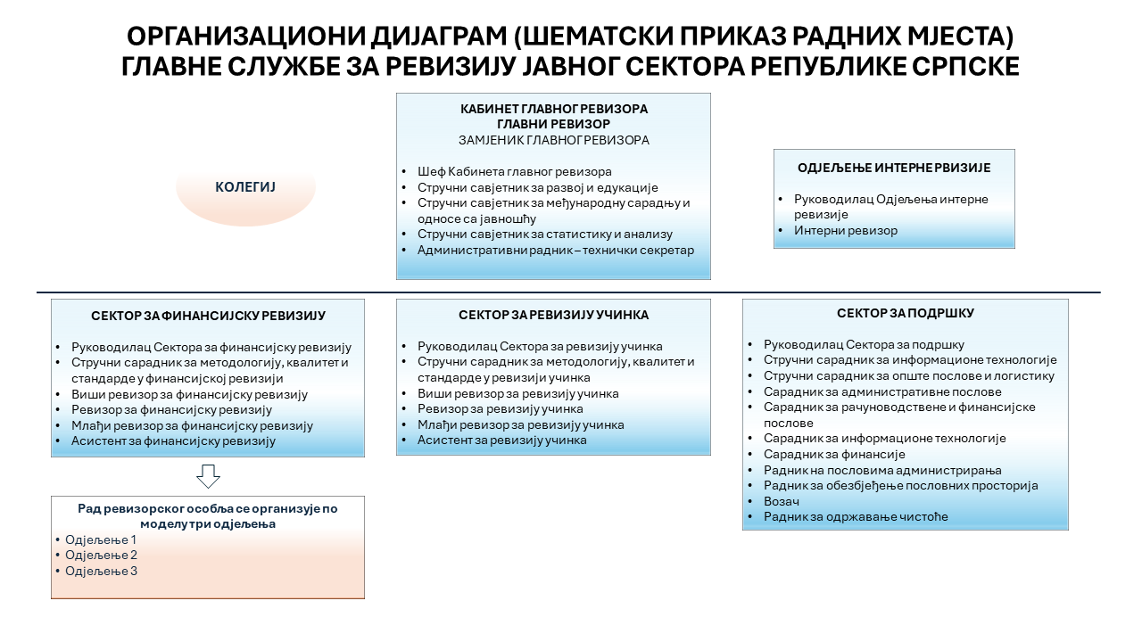 Послови из надлежности Главне службе за ревизију јавног сектора Републике Српске, обављају се у оквиру сљедећих организационих јединица: